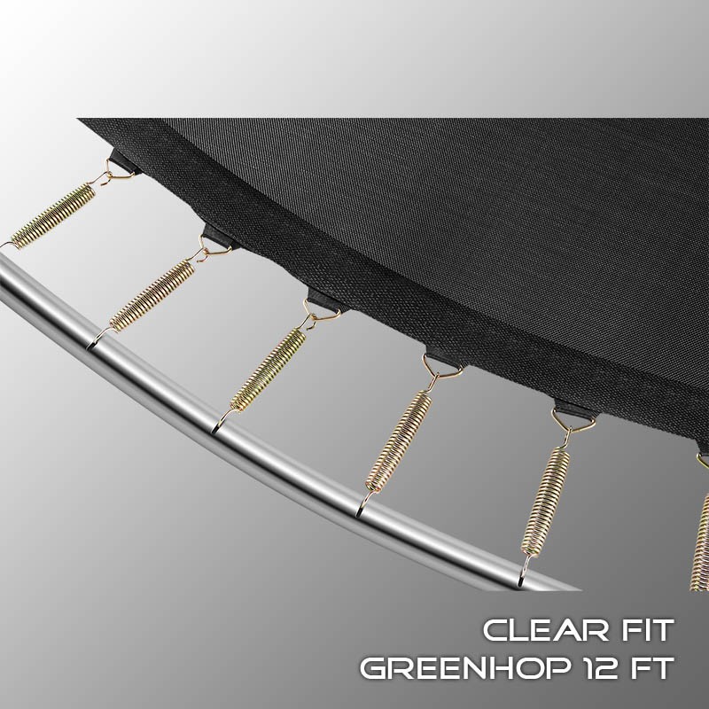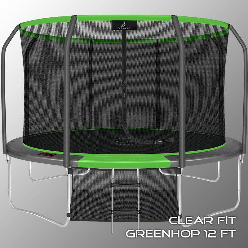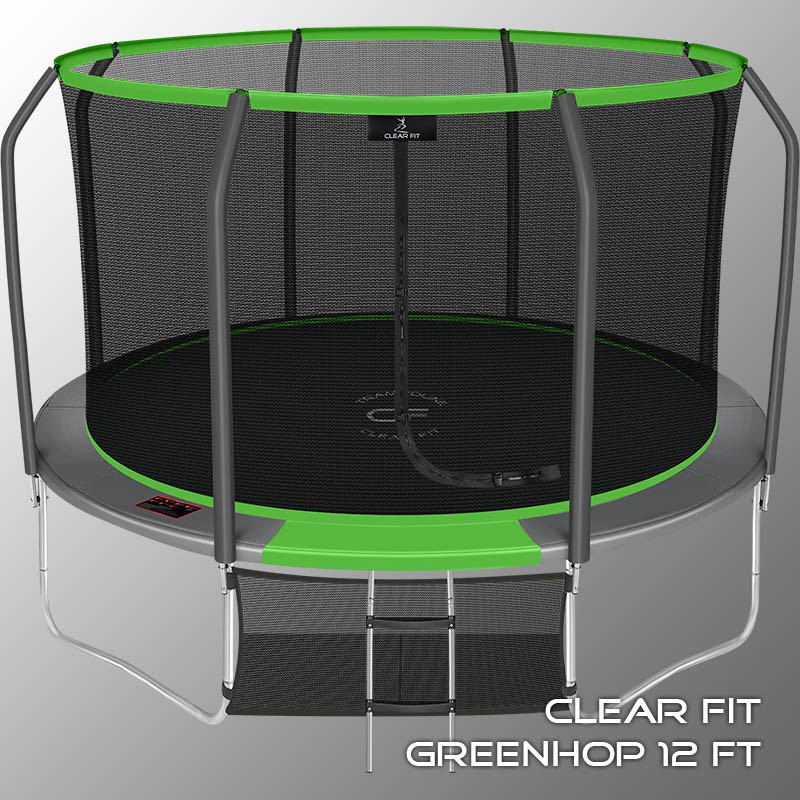 В 2026 году представлена обновленная линейка с улучшенной конструкцией каркаса. Усиление достигнуто за счет использования прочных Т-образных кронштейнов из металла толщиной 1.9 мм. Кроме того, в комплектацию добавлен карман для обуви. Каркасный батут с защитной сеткой Clear Fit серии GreenHop — отличаются комфортом и надежностью. Надежная рама из качественных комплектующих, прочная защитная сеть снабжена прямым креплением к прыжковому полотну и дополнительной защитой входа, наверху каркасное жесткое крепление, сеть не провисает и не слетает во время тренировок. Увлекательный, полезный и безопасный тренажер для всей семьи. Батуты серии GreenHop 10Ft, 12Ft, 14Ft и 16Ft поставляются в оптимальной для комфорта и безопасности комплектации: батут, верхняя защитная сеть, защитный мат, лестница и карман для обуви. Батут размером в 12 футов с прыжковой поверхностью 3.21 м идеально подходит для пользователей любого возраста, размеры полотна позволяют комфортно тренироваться взрослым и развлекаться детям, включая подростков. Верхняя защитная сеть оберегает от падений, усиленная молния и дополнительная защита входа уберегут малышей от случайного входа или падения. Надежный каркас из оцинкованной стали, качественные комплектующие и погодостойкие гальванизированные метизы рамы делает батут безопасным, устойчивым, надежным, гарантируют полную защиту от коррозии и долгий срок службы. Максимальный вес пользователя батута GreenHop 12Ft — до 200 кг.
