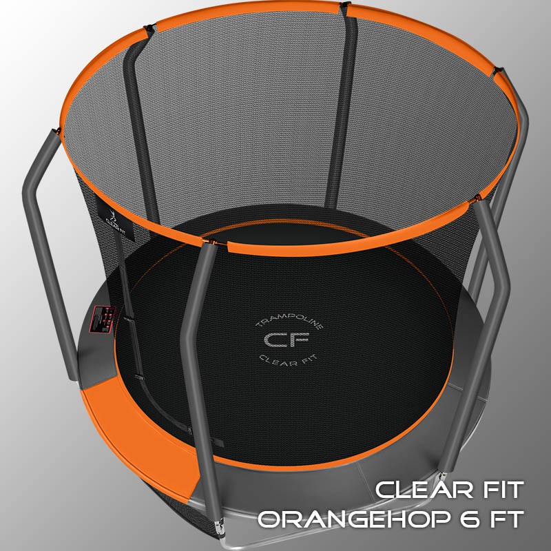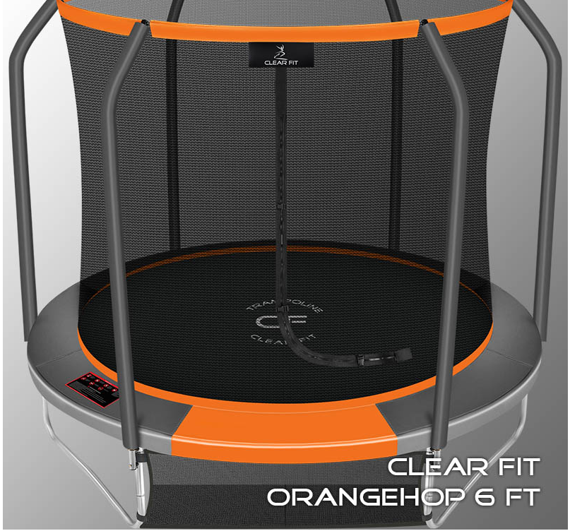 В 2026 году представлена обновленная линейка с улучшенной конструкцией каркаса. Усиление достигнуто за счет использования прочных Т-образных кронштейнов из металла толщиной 1.9 мм. Кроме того, в комплектацию добавлен карман для обуви. Каркасный батут с защитной сеткой Clear Fit серии OrangeHop — отличаются комфортом и надежностью. Надежная рама из качественных комплектующих, прочная защитная сеть снабжена прямым креплением к прыжковому полотну и дополнительной защитой входа, наверху каркасное жесткое крепление, сеть не провисает и не слетает во время тренировок. Увлекательный, полезный и безопасный тренажер для всей семьи. Батуты серии OrangeHop 6Ft и 8Ft поставляются в оптимальной для комфорта и безопасности комплектации: батут, верхняя защитная сеть, защитный мат и карман для обуви. Размер батута 6 футов с прыжковой поверхностью 1.42 м и его легко разместить на небольшом участке, он подойдет для детских игр и для тренировок. Верхняя защитная сеть оберегает от падений, усиленная молния и дополнительная защита входа уберегут малышей от случайного входа или падения. Надежный каркас из гальванизированной стали, качественные комплектующие и погодостойкие метизы рамы делают батут безопасным, устойчивым, надежным, гарантируют полную защиту от коррозии и долгий срок службы. Максимальный вес пользователя батута OrangeHop 6Ft — до 130 кг.