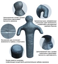 Борцовский манекен классического кроя (одноногий, с совмещенными ногами) чаще всего используется для отработки бросков в греко-римской борьбе. Также такая модель применятся для повышения скорости и техничности в вольной борьбе и в самбо. Манекен с совмещенными ногами позволяет отрабатывать броски с акцентом на верхнюю часть туловища. Особенностью манекенов производства Абсолют Системс является набивка: преобладание в наполнителе синтепоновой крошки предохраняет его от слеживания, усадки и делает снаряд упругим, набивка производится преимущественно через ноги. Манекены Абсолют Системс изготовлены по уникальному крою: руки манекена и голова не пришиваются отдельно, а являются частью торса. Такой крой значительно увеличивает прочность манекена, т.к. наиболее часто манекены рвутся на соединении рук и головы с торсом. Все швы на рабочей поверхности манекена внутренние. Руки слегка удлиненные - это даёт возможность отрабатывать такие броски как "вертушка", "мельница" и др. Ярко выраженный силуэт, максимально приближенный к человеческому, также является особенностью наших манекенов. Долговечность снаряда обеспечивается благодаря высококачественной коже, которая изнутри армируется синтетической тканью.Изготовлен в соответствии с рекомендациями научных сотрудников кафедры борьбы РГУФК. При подборе манекена следует ориентироваться на то, что снаряд должен быть на 10-15 см ниже борца (имитация стойки) и в два раза легче (так как манекен не сгибается в поясе подобно человеку, то при амплитудных бросках вес манекена ощущается как удвоенный из-за возникающего момента силы). Каждый манекен Абсолют Системс проходит предпродажное тестирование.