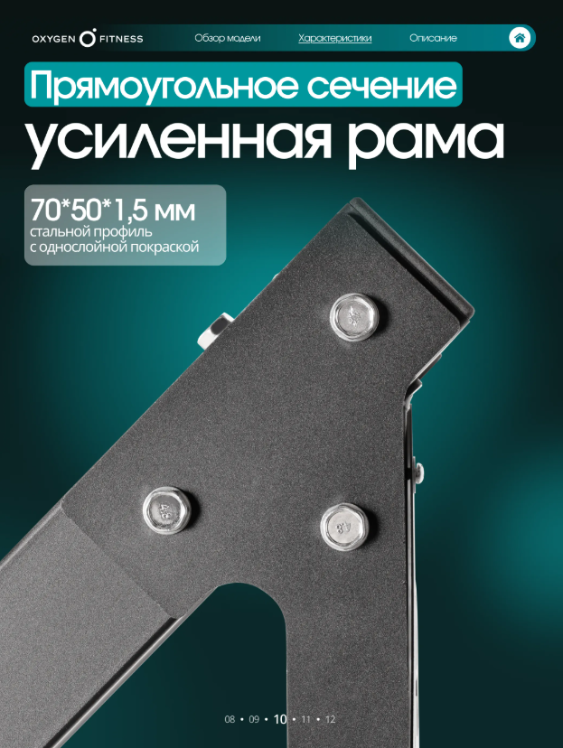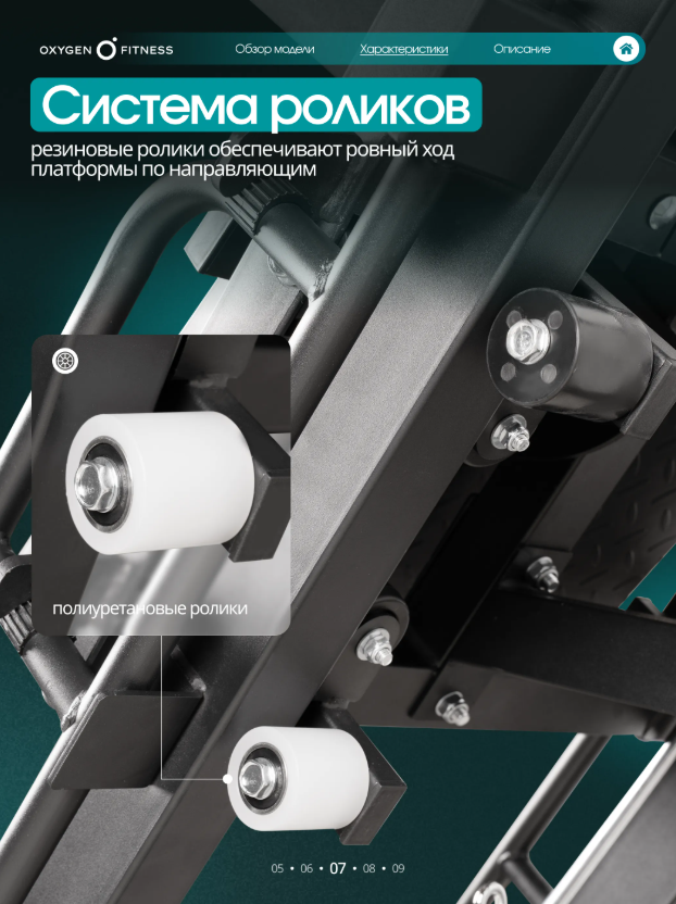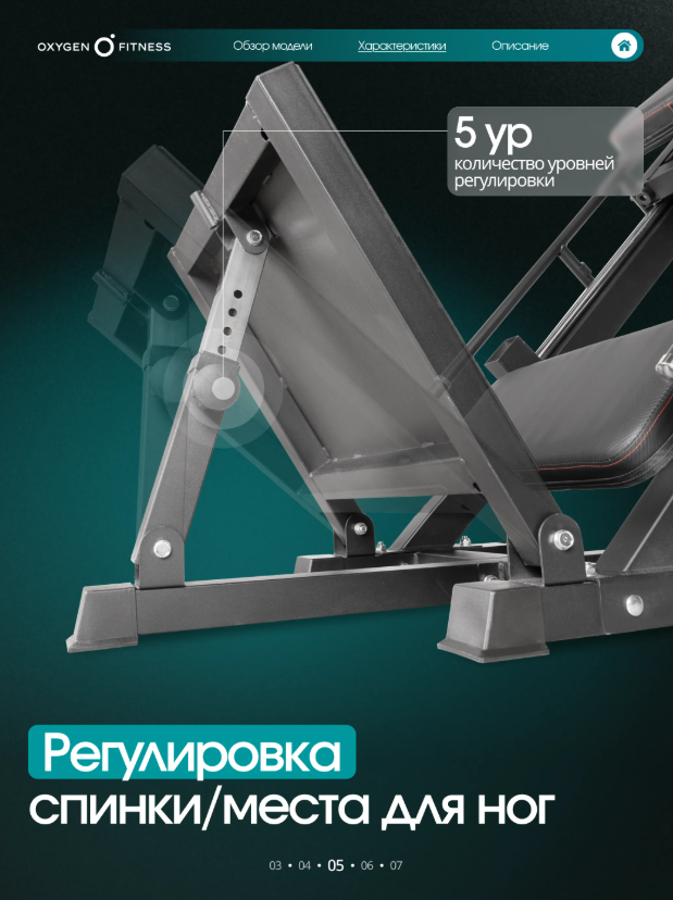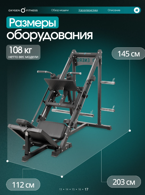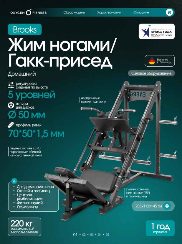 OXYGEN FITNESS BROOKS - это мощный комбинированный тренажёр для жима ногами и гакк-приседа, рассчитанный на домашнее использование, но выполненный на уровне профессионального силового оборудования. Конструкция работает со свободными весами, обеспечивая естественную биомеханику и точную нагрузку на мышцы нижней части тела. Продуманный угол платформы (45°) и жёсткая рама делают тренировки безопасными, стабильными и комфортными даже при интенсивных нагрузках. Максимальный вес пользователя —220 кг. Основа тренажёра — усиленная стальная рама квадратного профиля 70×50 мм с толщиной стенки1,5 мм, обеспечивающая жёсткость и долговечность. Рабочая платформа для ног размером 52×28 см даёт уверенную опору для всех видов постановки стопы. Сиденье эргономичное: наполнено PU-пеной, обито износостойкой искусственной кожей. Размеры подушек: • спинка — 65×36×5 см, • сиденье — 50×26×5 см. Дополнительно тренажёр оснащён: • 4 накопителями для дисков Ø50 мм, • 6 пружинными замками, • 2 неопреновыми валиками Ø90, • обрезиненными ручками для комфортного хвата. Посадочный диаметр для дисков —51 мм. Габариты в рабочем положении: 203 × 112 ×145 см. Вес нетто —108 кг. Тренажёр позволяет выполнять два ключевых упражнения: • Жим ногами под углом 45°, • Гакк-присед. Проработка мышц: • квадрицепс, • бицепс бедра, • ягодичные мышцы, • приводящие и отводящие мышцы бедра, • икроножная и передняя большеберцовая мышцы, • прямая мышца живота, • прямая мышца спины. Такой охват делает BROOKS полноценным решением для укрепления ног и корпуса.