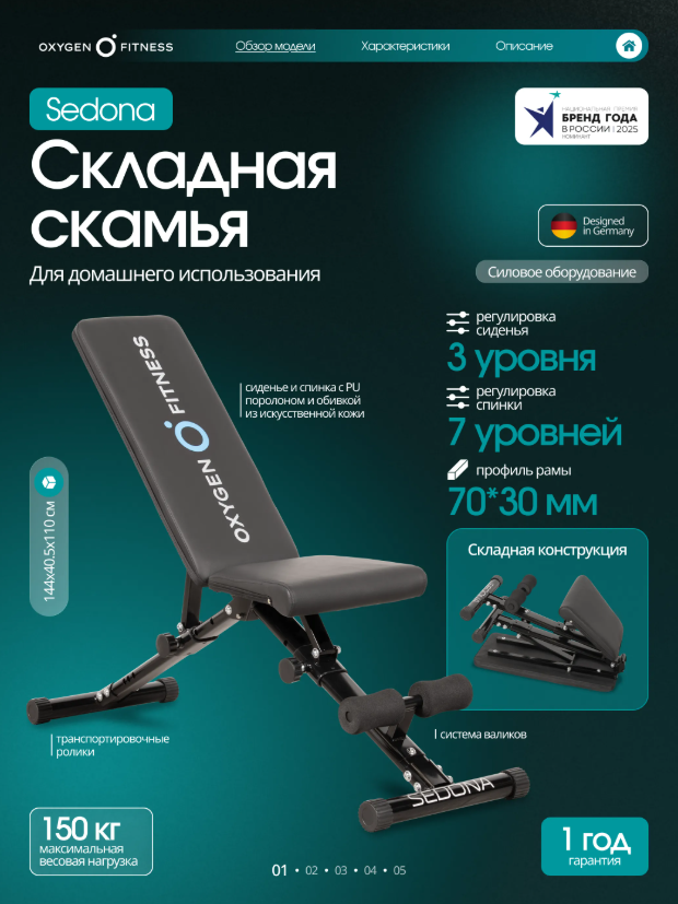 Силовая скамья OXYGEN FITNESS SEDONA — это идеальный тренажер для домашних тренировок, предназначенный для эффективной тренировки мышц рук, груди, плеч и торса. В сложенном виде скамья имеет компактные размеры (83 смв длину,40.5 смв ширину и29 смв высоту), что позволяет легко хранить ее даже в ограниченном пространстве. Прочная рама с толщиной профиля1.8 ммобеспечивает надежность и стабильность во время тренировок. Скамья OXYGEN FITNESS SEDONA позволяет выполнять разнообразные упражнения, включая жим лежа и различные вариации упражнений на спину и руки. Эргономичное сиденье, наполненное PU поролоном и обитое искусственной кожей, обеспечивает комфортную поддержку во время занятий. Возможность регулировки сиденья (3 уровня) и спинки (7 уровней) позволяет адаптировать скамью под индивидуальные параметры пользователя, что делает тренировки более эффективными и персонализированными. Эта скамья дополнена 2 неопреновыми валиками для ног, которые обеспечивают дополнительный комфорт и поддержку во время выполнения упражнений. Размеры подушек составляют 36*36*4 см для сиденья и 73*28.5*4 см для спинки, что обеспечивает оптимальное распределение нагрузки и удобство. Силовая скамья OXYGEN FITNESS SEDONA — это отличный выбор для тех, кто стремится к эффективным и комфортным тренировкам в домашних условиях, сочетая функциональность и удобство в одном устройстве. Ключевые преимущества OXYGEN FITNESS SEDONA: • многофункциональность: возможность тренировки различных групп мышц, включая руки, грудь и плечи, что делает скамью универсальным инструментом для домашних тренировок; • комфорт: эргономичное сиденье и многоуровневая регулировка обеспечивают максимальный комфорт и поддержку во время тренировок; • компактность: складывающаяся конструкция позволяет легко хранить скамью в небольших помещениях.