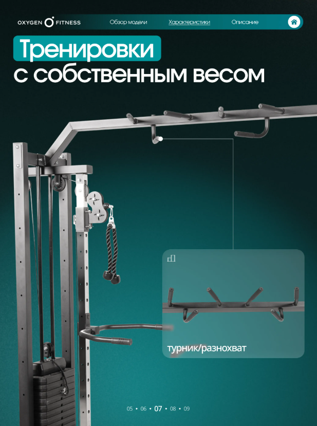 OXYGEN FITNESS VESTON - это мощный полукоммерческий кроссовер с полным функционалом для развития мышц верхней части тела, корпуса и рук. Тренажёр оснащён двумя независимыми грузоблоками и множеством дополнительных станций, что делает его универсальным решением для небольших залов, студий, фитнес-клубов и продвинутых домашних тренировочных зон. Конструкция рассчитана на интенсивное использование и высокие нагрузки: максимальный вес пользователя - 220 кг, максимальная нагрузка - 140 кг. Основа тренажёра — жёсткая рама прямоугольного профиля 70×50 мм с толщиной стенки 1,5 мм, обеспечивающая идеальную устойчивость и долговечность. В комплексе используются два грузоблока по 70 кг каждый (12+12 плит), выполненные из прочной композитной плиты. Вес одной плиты — 5,7 кг. Передача нагрузки осуществляется через стальные тросы диаметром 6 мм — надёжные, износостойкие и рассчитанные на долгий срок службы. Габариты в рабочем положении: • 130 × 295 × 230 см. Вес нетто — 244 кг. VESTON предлагает широкий диапазон тренировок за счёт продуманной конструкции и прикладных аксессуаров: • Кроссовер с регулируемыми рычагами (8 уровней по высоте) — упражнения на грудные, плечи, спину, руки и корпус. • Многофункциональный турник — подтягивания разными хватами, тренировка спины и мышц кора. • Брусья с регулировкой по высоте (15 уровней) — проработка трицепса, грудных и стабилизаторов. • Многофункциональная рычажная тяга — вариативная работа на широчайшие и мышцы спины. • Канат для трицепса — точечная изоляция рук. Дополнительно предусмотрены: • 2 пружинных замка, • накопители под диски Ø50 мм для удобной организации пространства.